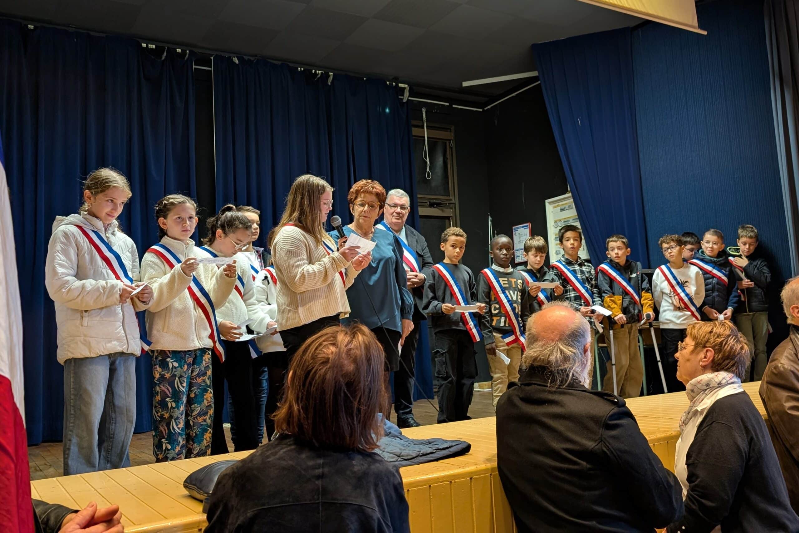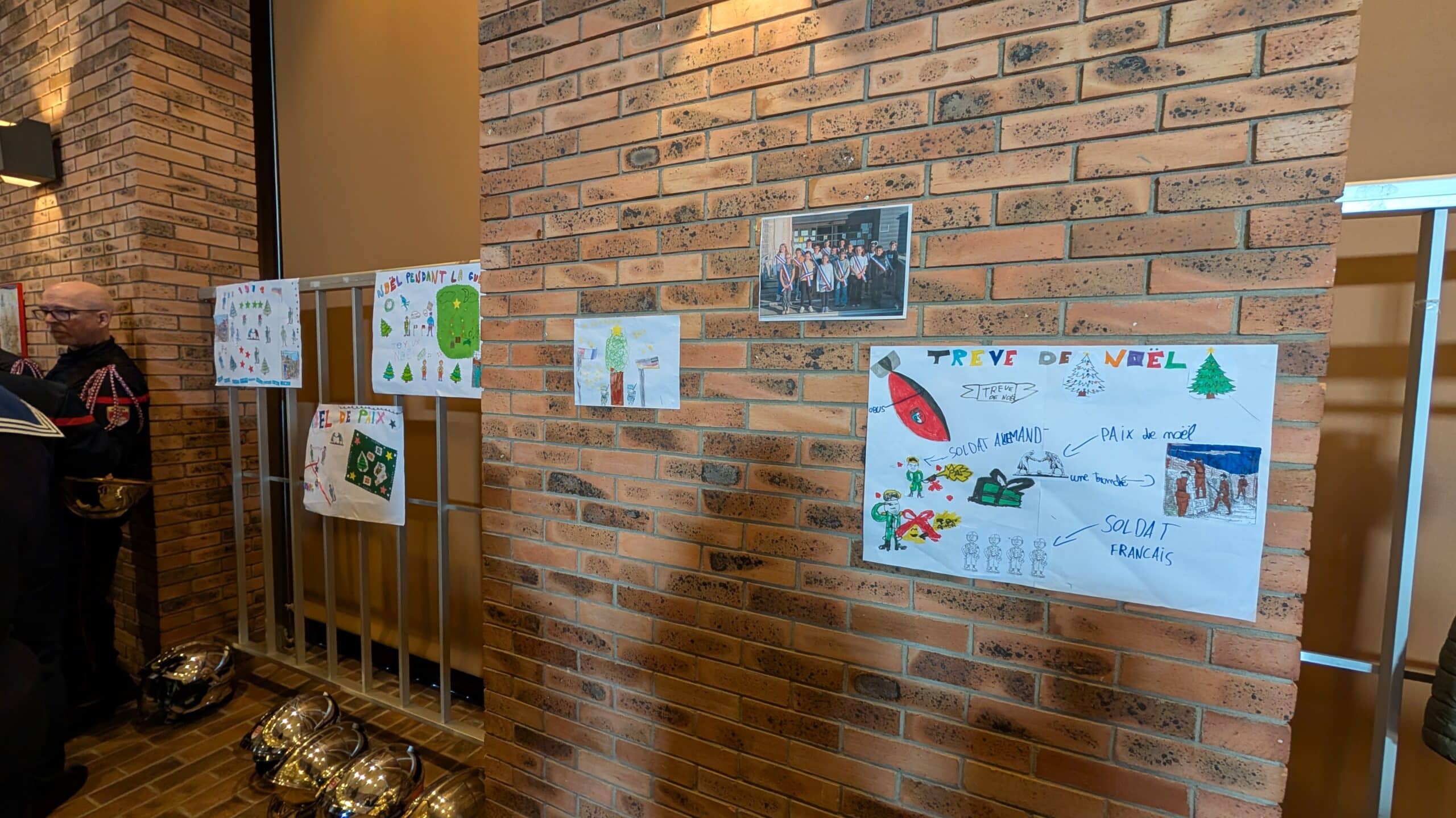 Après la procession jusqu’au monument aux morts, un dépôt de gerbe et une minute de silence ont été observés. Le cortège s’est ensuite retrouvé dans la salle polyvalente de l’Hôtel de Ville, où les jeunes du Conseil Municipal des Enfants ont lu des extraits d’une lettre écrite par un soldat lors de la trêve de Noël de 1914. Ils ont également illustré ce témoignage à travers quelques fresques :