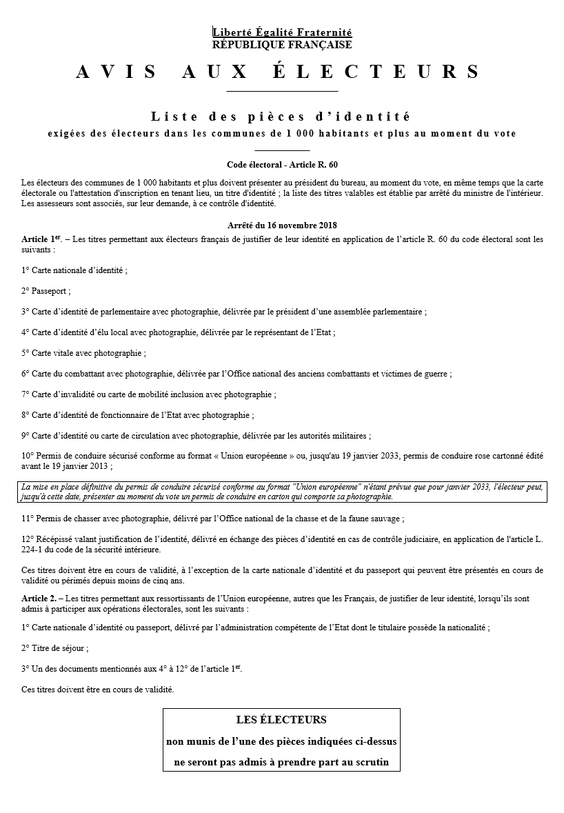 Pour glisser votre bulletin dans l'urne, munissez-vous de l'un des documents originaux suivants (𝙚𝙣 𝙫𝙚𝙧𝙨𝙞𝙤𝙣 𝙥𝙝𝙮𝙨𝙞𝙦𝙪𝙚) :