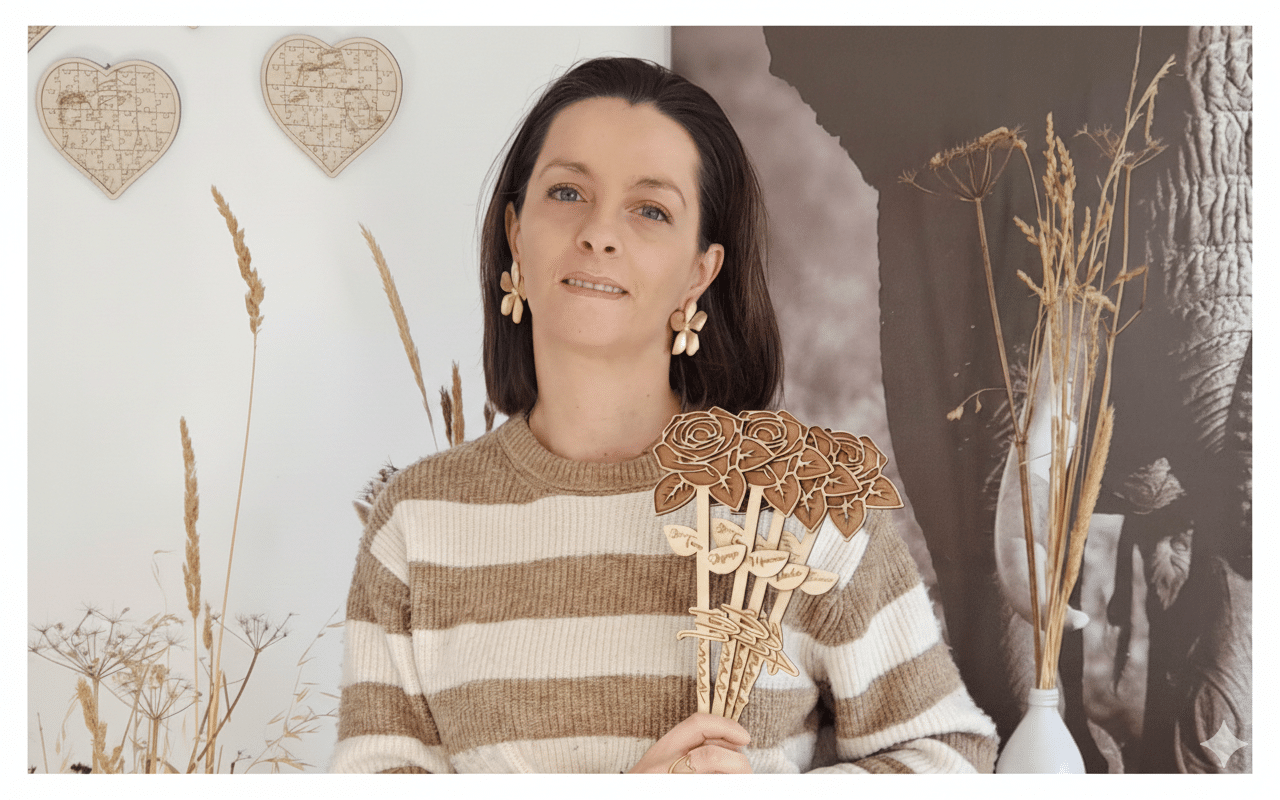 Dans son atelier, elle imagine et grave avec soin des objets en bois personnalisés, disponibles sur sa boutique en ligne :
