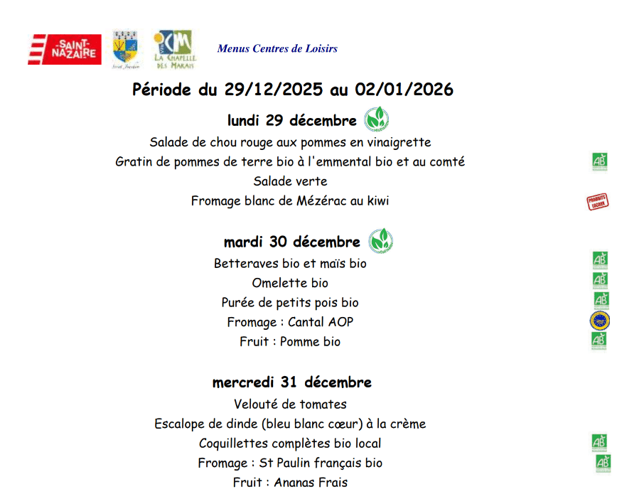 Notre prestataire est l’UPAM, dont la cuisine centrale est basée à Saint-Nazaire. La diététicienne élabore les menus en privilégiant la qualité et la variété des aliments. Ceux-ci sont sélectionnés avec rigueur pour leurs qualités gustatives et dans le respect strict des normes de traçabilité. Une Commission Consultative Restauration, regroupant les villes partenaires (et à laquelle la Mairie peut participer), valide ces menus périodiquement.